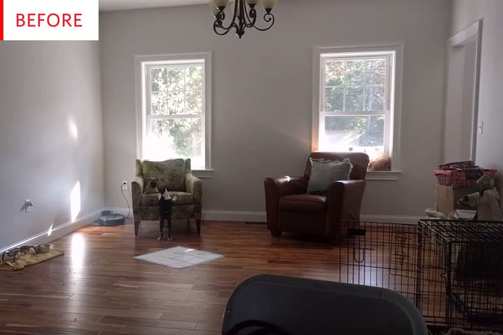 Before and After: This Living Room’s New Bookshelves Have a Built-In Dog Door
