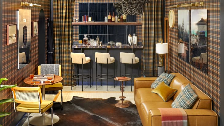 This preppy-meets-posh sitting room titled “Make it Fashion” by designer DuVäl Reynolds features matching dark blue plaid wallpaper and curtain panels. Reynold’s drapery adorns a faux window he made out of mirrors — another great idea to steal for small spaces, where natural light may be lacking. On the whole, though, this room feels super-cohesive and pulled-together because of the use of the matching plaids. The midnight blue Clare paint color Goodnight Moon, which is used to create the look of paneling on the walls, also helps to break the matching plaids up.