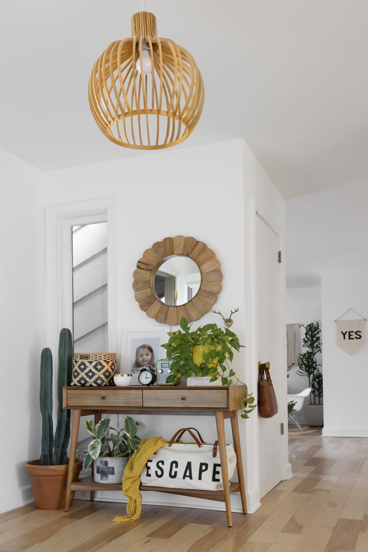 Glitzy gold looks sophisticated, not gaudy, when it’s paired with a simple shape. Lindsay of Leaf + Lolo kept her entryway scheme minimal with just a mirror and bench and then let some of her beloved plants bring some added oomph.