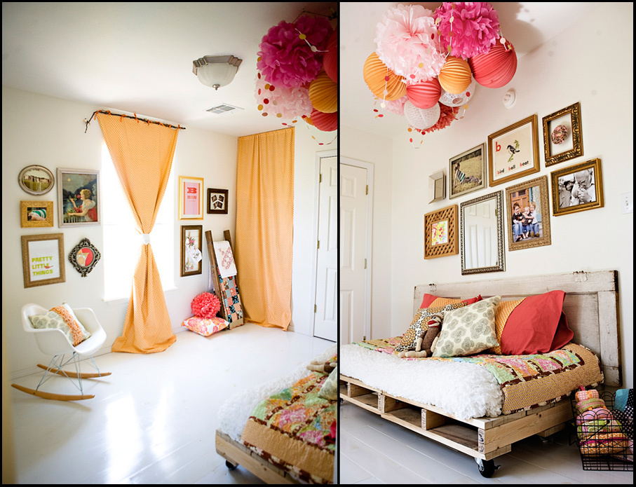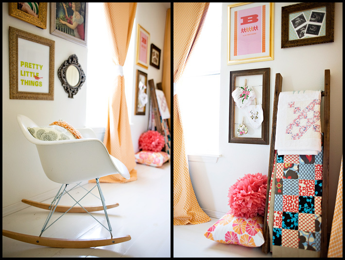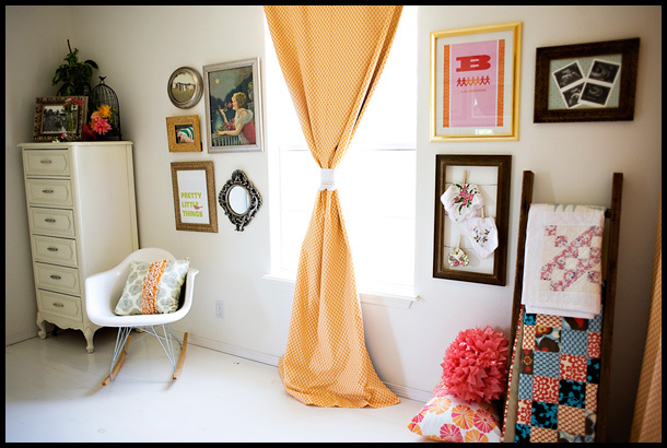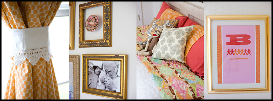 Resources: • Paper lanterns and pom-poms by Martha Stewart for Walmart (and here and here) • B is for Brothers print designed by Lesley Zellers • Pretty Little Things poster by Paper Relish • Many fabrics used are designed by Amy Butler including Full Moon Polkadot in Tangerine for the curtains.