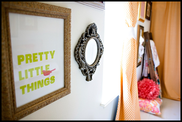 If you told us this nursery was put together by an interior designer (it wasn’t) we’d be impressed. If you told us this nursery was put together by a mother with three young boys underfoot (it was) we’d be really impressed. If you told us this nursery was put together by a pregnant mother of three boys expecting her first daughter any day now (it was!) well, we’d be sort of awed. Here Ashley has made more than just a gorgeous room. She’s filled it with handmade gifts, keepsakes and reminders of family – a quilt sewn by an aunt, an art print designed by a sister, a mirror received as a wedding gift, antique handkerchiefs from a grandmother and great grandmother, a treasured photo of beloved grandparents – that will surround her daughter and welcome her into the family fold.
