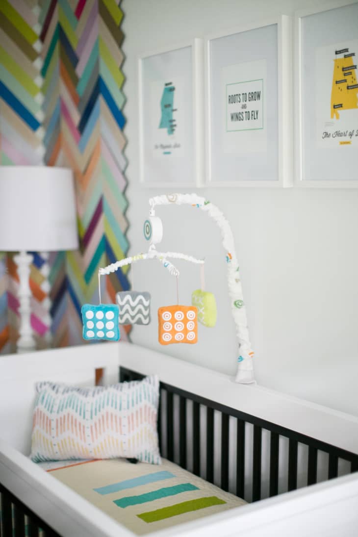 My favorite element is the hand knit blanket my sister gave Olive that hangs on her glider. That was one of Olive’s first gifts, and it inspired me to make the room so colorful. But I also love the states hanging over the crib – they were a gift from our friends Jen and Omar who own These are Things. We are avid travelers and wanted to incorporate maps and places, so to have maps of our home states over her crib symbolized a lot to me. I want her to go and see the world, but I want her to know where she comes from too.