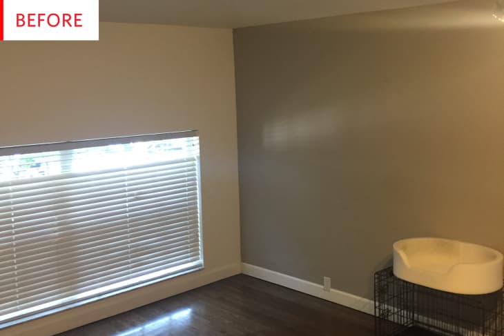 Before we get to the big reveal, here’s a look at the corner again, from head to toe. Not much to see here, other than some beige walls and a dog crate. Right inside the front door, however, is one of those spots where clutter piles up quickly and, without a good organizational system, can quickly get out of control with mountains of shoes, dog leashes, and discarded bags and gym gear.