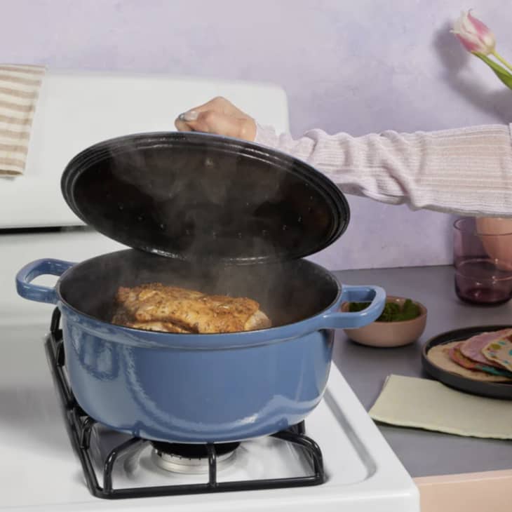 There are a ton of cool design features specific to the Cast Iron Perfect Pot, too, including a dome-shaped lid that’s designed to self-baste, which makes it ideal for braised dishes you want to keep moist and juicy; thoughtful handles that securely hold the included wooden spoon and Hot Grips; and tall sides that help reduce the amount of oil splatter if you’re frying meats or veggies. Best of all, though, is that the Cast Iron Perfect Pot is gorgeous enough to be an heirloom piece — take it straight from the oven to the dinner table, then pass it down for generations. (It’s quality cast iron, so chances are, it’ll outlive us all.)