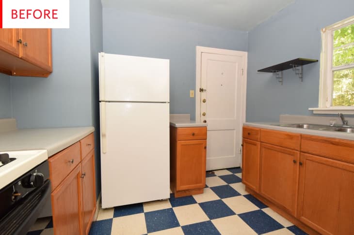 Before anyone gets too attached to this kitchen’s double-blue style or admittedly charming checkered floor, it should be known that the charming floor was actually rotting—and there were a lot of other issues as well. Not an enormous surprise in a rental, but one renter was determined to give this kitchen a fresh start. Thankfully, she had a lenient landlord who was open to changes.