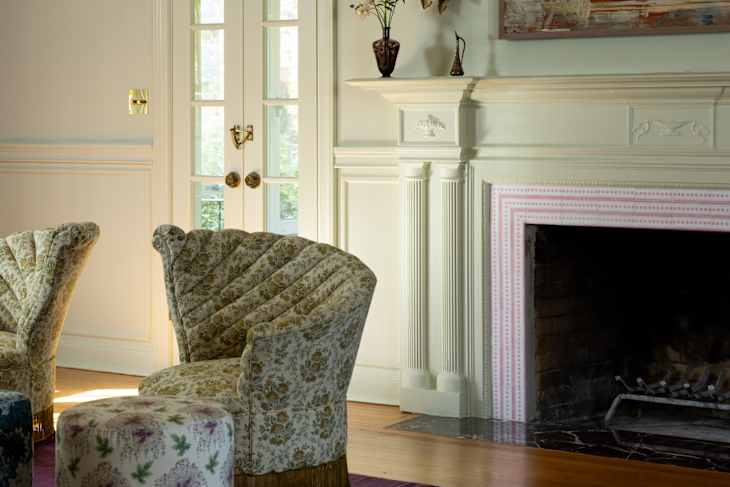 Velten drew her inspiration from “eccentric” fireplaces in the iconic Bloomsbury Group meeting place Charleston House and the Chelsea Hotel, all hand-painted by artists. “We wanted to play with the shocking color pink in a sort of not totally sweetened way and have a hand-painted quality,” the designer says. A simple, repeating pattern like this dotted one is straightforward for DIYers to replicate — and if it actually looks hand-drawn, all the better.