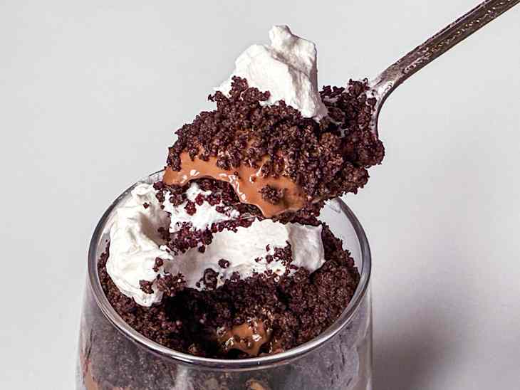 In a trifle dish (deep-sided bowl) — or 10 to 12 individual parfait dishes or stemless wine glasses — layer the ingredients about 1 inch high in this order: coarsely crumbled chocolate cake, pudding, Oreo crumbs, and Cool Whip. Repeat until you hit the top, finishing with a final cloud of Cool Whip plus a sprinkling of cake and/or Oreo crumbs.