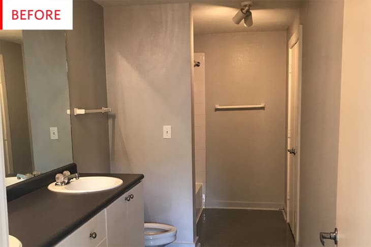 When Patricia moved into her rental loft earlier this year, her least favorite room in the whole place was the bathroom. The rest of the place is open, with tall ceilings and plenty of natural light. The bathroom, however, was old, grey, and windowless —basically the complete opposite of the rest of the home. Her leasing manager is extremely friendly, but wasn’t okay with her making any major changes. So, Patricia started making small tweaks to improve the space, bit by bit.
