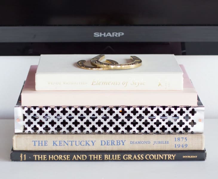 This cable box is hidden in plain sight amongst other items on her media cabinet. It lives in a custom box (made by Me and Mr. Jones) that uses some wood and a metal patterned sheet.