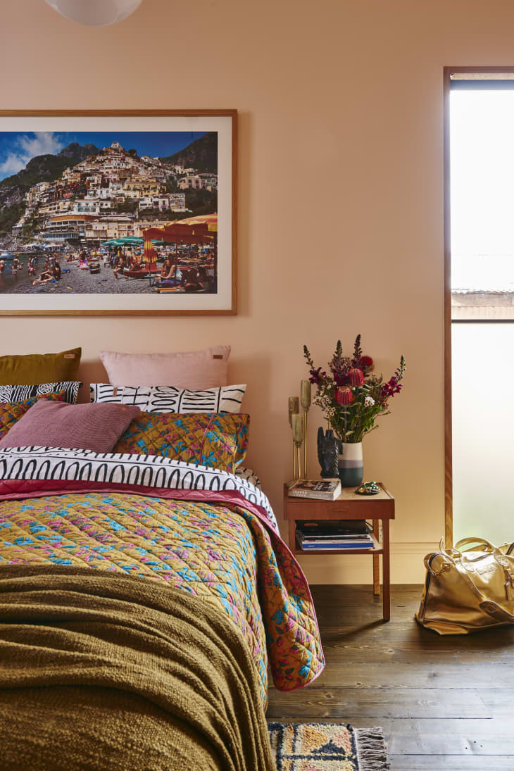 Want to know a designer secret? Painting bedrooms or bathrooms in a soft shade of pink can make *almost* everything (and everyone) in it look amazing. Opt for a hue in a “peachy” realm, like the soft walls in the main bedroom of this Australian abode.