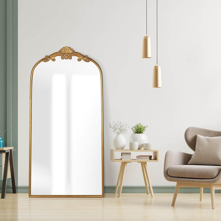 The piece, called Azalea Park Gold Metal Filigree Floor Mirror, is 72 inches tall by 36 inches wide, has a double-sided steel frame with gold finish, and is narrower than Anthropologie’s mirror.