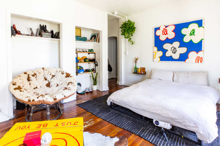 Instead of filling a built-in closet nook with clothes, L.A.-based creative director Willow Rothbart took a decorative-yet-still-functional approach by installing a three-tiered, industrial-looking shelf. Even in a 500-square-foot studio apartment, this storage idea feels clever and well-designed, especially with footwear living alongside records, cameras, and a plant.