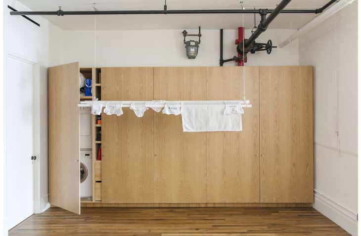 Elizabeth Roberts designed this stunning loft apartment that cleverly hides a functional laundry. Against one wall is a long built-in storage unit, the left side of which houses a stackable washer and dryer. A simple drying rack for clothes raises and lowers by pulley. When the door is closed and the bar is raised, you’d have no idea what the space is used for. Also lead image above.