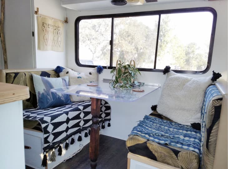 Above, Liz Kamarul recently renovated her trailer, installing an acrylic table to make the space seem airier. Lucite is also a somewhat unexpected design detail in a mobile home, and adds an interesting element.