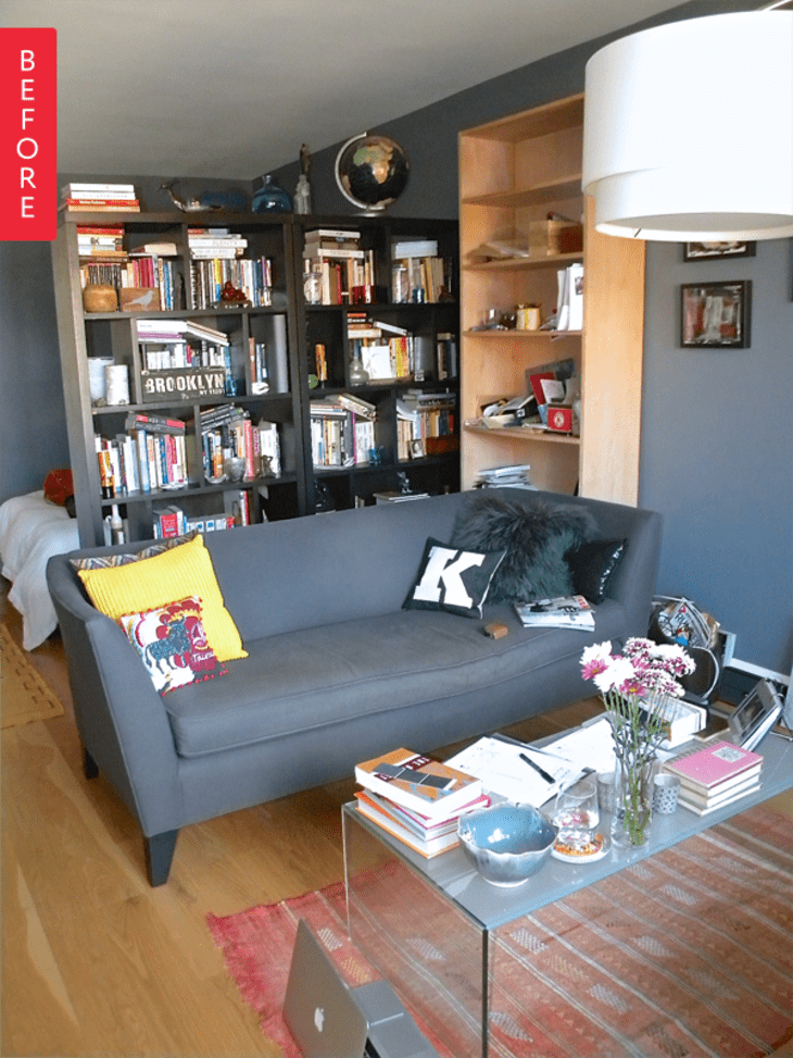 Studio apartments are tough for lots of reasons. Like, you know, having to fit everything you own in one room and having to eat in the same room you sleep in. Though the photo above of a 640 square foot studio apartment in New York City is far from unlivable, it does feel a bit busy, and the big, heavy, full bookcase as a divider is a little imposing.