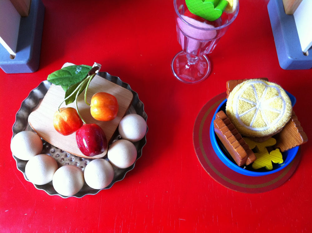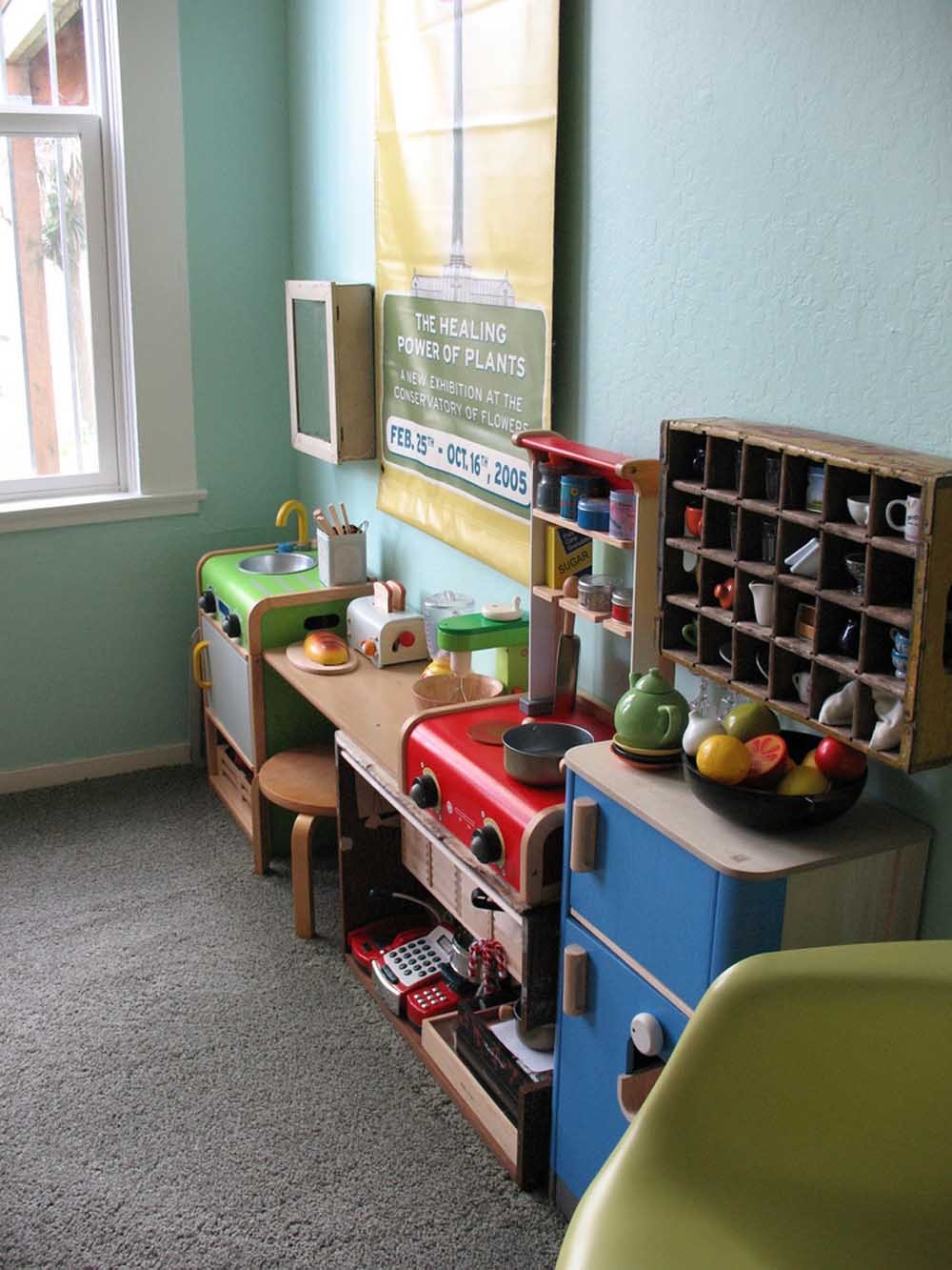 The goal was to have it feel like Stella’s own room, not her dad’s office, and the main play area pulls you in toward the windows so we breeze right by his desk area and into the main space. The feel is serene. It doesn’t at all feel like an office. It’s a peaceful place to read, and a fun place to play. While I am a huge fan of objet trouvé and vintage pieces, we had a formidable collection of play kitchen equipment that needed a home, so a lot of the feel of the room is dictated by the colors and activity in the play kitchen. We squeezed a lot of function into this space.