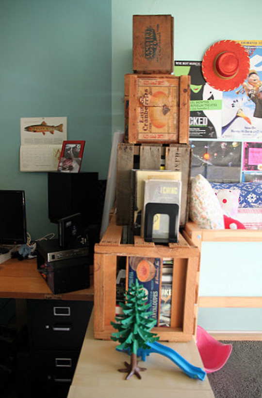 You mean besides laying the carpet by myself with a baby strapped to my chest? Making sure that everyone has enough natural light, while protecting Stella from the glare of the computer screens if one of us comes in the room to work at night. The space above the crate divider and the way it steps down lets in a lot of daylight, but the taller portion keeps Stella’s bed area dark for sleeping. Also, securing it. We live in earthquake country. There are lots of thin cables connecting the units to the ceiling joists, screws from inside the crates to the wall studs, and screws from crate to crate. But most importantly, I left a pin connection at the bottom of the stack of crates, so that in a quake it will slide back and forth on the slick finished surface of the Ikea Expedit bookcase below, giving David’s books a chance to shake out onto his desk before any crate might start to think about coming off the cables.