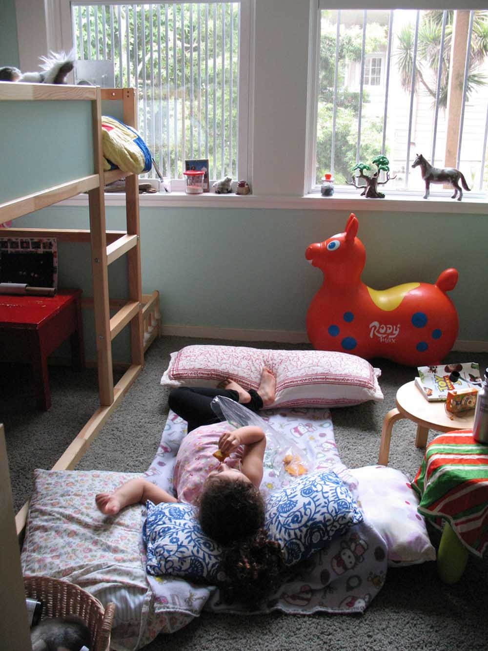 I really miss being able to snuggle with Stella easily and readily, but the IKEA loft bed we bought has a weight limitation that I just don’t like to test. I might’ve scrapped the whole raised bed idea if I knew I couldn’t just jump onto the bed and read her a book. So we let her fall asleep in our bed every once in a while so we can read and drift off to sleep together. The good thing about the loft, of course, is the extra floor area below it, that one day will be where Oliver sleeps.