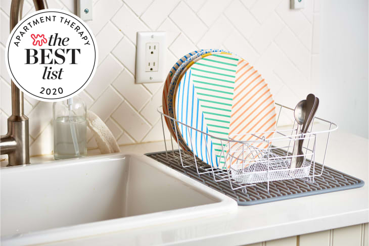 This folding bamboo dish rack was one of my first apartment purchases, and I still think it’s one of the best options. At just under $20, it’s a fantastic price for what you’re getting and is ideal for small spaces thanks to its folding design. Place bowls and plates on the top and mugs and cups on the bottom, and you’re set. There are a few flaws, though: There’s no drainage system, so you’ll need a mat or tray to keep your counter from getting wet (I recommend this one), and it’s not very convenient for drying larger pots and pans. There is a matching utensil holder, but it’s sold separately for $8. All in all, it’s a very bare-bones purchase, and you’ll need to spend some more to get everything you need for your setup, but it’ll get the job done well (and look good while doing it).