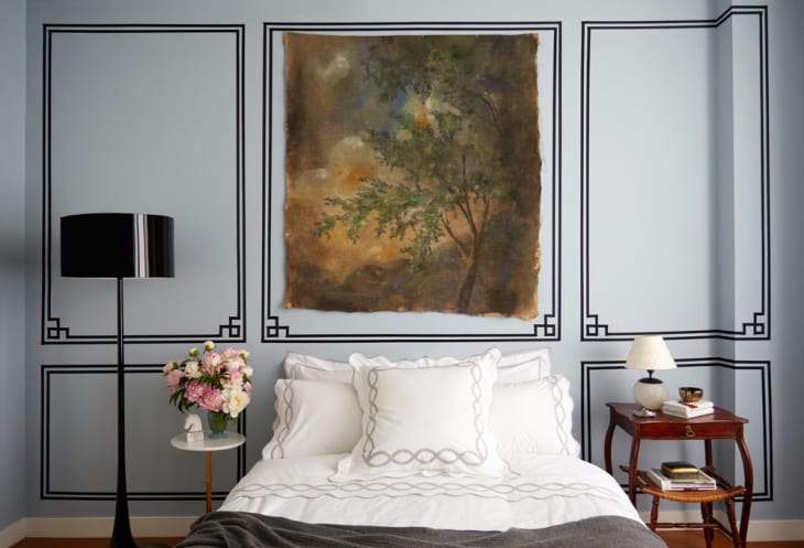 From Megan Pflug Designs, here’s a clever way to draw attention to a larger piece, without spending a fortune on framing: paint a border around it. In this project, the border (which is actually black ribbon tacked to the wall) helps to define the space and adds architectural interest, as well as draws your eye toward the art above the bed.