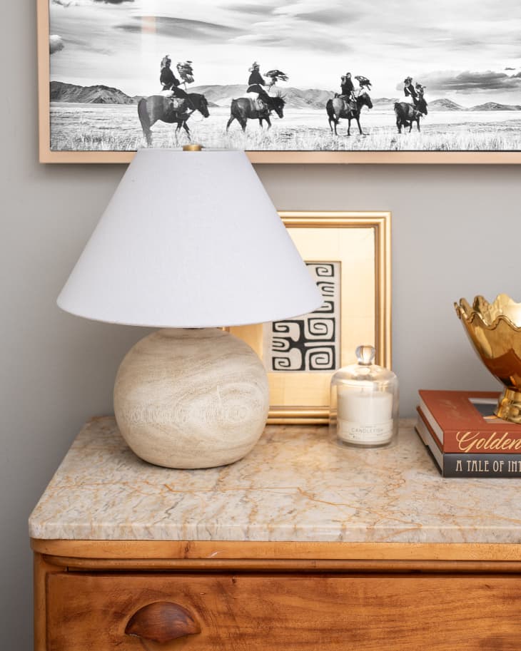 What I love about this lamp is how high-end and stylish it looks for the price. Anyone who’s purchased lighting before knows that $40 for a lamp base and shade is an amazing deal, especially for something that’s fairly sizable at 16 inches tall and about 14 inches wide. It’s rare to find a base that’s so sophisticated-looking and falls within a reasonable budget. Search the internet and you’ll find many lamps that look quite similar to this one going for several hundreds of dollars, probably because this one is a lightweight resin dupe that looks exactly like pricy wood.