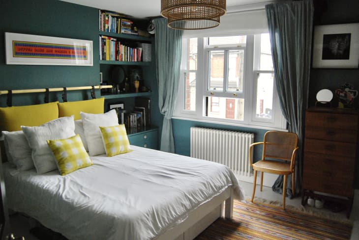 Among all the projects they’ve tackled, Simon and Emma count their headboard as one of their proudest DIYs, explaining that it’s just a wooden pole with two cushions attached by belts that sits behind a simple frameless Japanese-style bed. You’ve maybe seen a style like this before at Anthropologie or Burke Decor, but when you shop for a design like this at retail, you often have to purchase a bed with a built-in rail and then purchase the cushion separately, which can get pricey. DIYing will definitely save. you money here and allow you to customize the size of your headboard, too. “We wanted king size but standard beds we liked were all too big for the space,” says Emma. “Really pleased as we have a compact but generous bed that works well in the space.”