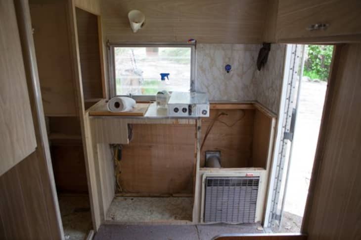 Meg writes: We gutted the camper because of the water damage that had occurred from the previous winter and started filling the holes and fixing the siding. After everything was patched and properly fixed, we sanded, painted and redid the flooring. Then we installed a custom bed, cabinets, shelving, and installed a handmade bench and side table.