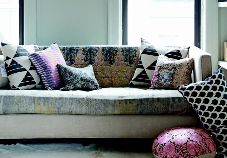 Like color, pattern can be one of those anxiety-provoking design elements for the novice decorator. You think: “How can I tell if these prints go together?” “What if I’m using too many patterns?” “What if I get sick of them a month from now?” To help ease our pattern-phobic thoughts, we asked Rebecca Atwood, author of the new book Living with Pattern and the Brooklyn-based designer behind these swoon-worthy textiles, for her low-risk, high-reward approach to decorating with prints. What we got was so much better than expected: A two-minute trick for using a patterned throw, quilt or rug to “reupholster” a couch. It’s pretty, inexpensive—and completely reversible.