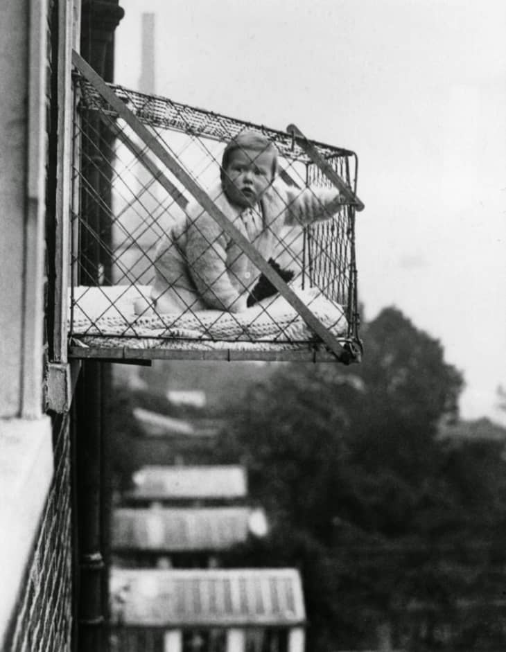 The baby cage itself wasn’t invented until 1922 by Emma Read. According to available photos we found, it looks like use of the cages peaked around the ’30s. In fact, the Daily Mail reports that the East London Borough council proposed to gift the cages to some of their city tenants to promote their use.