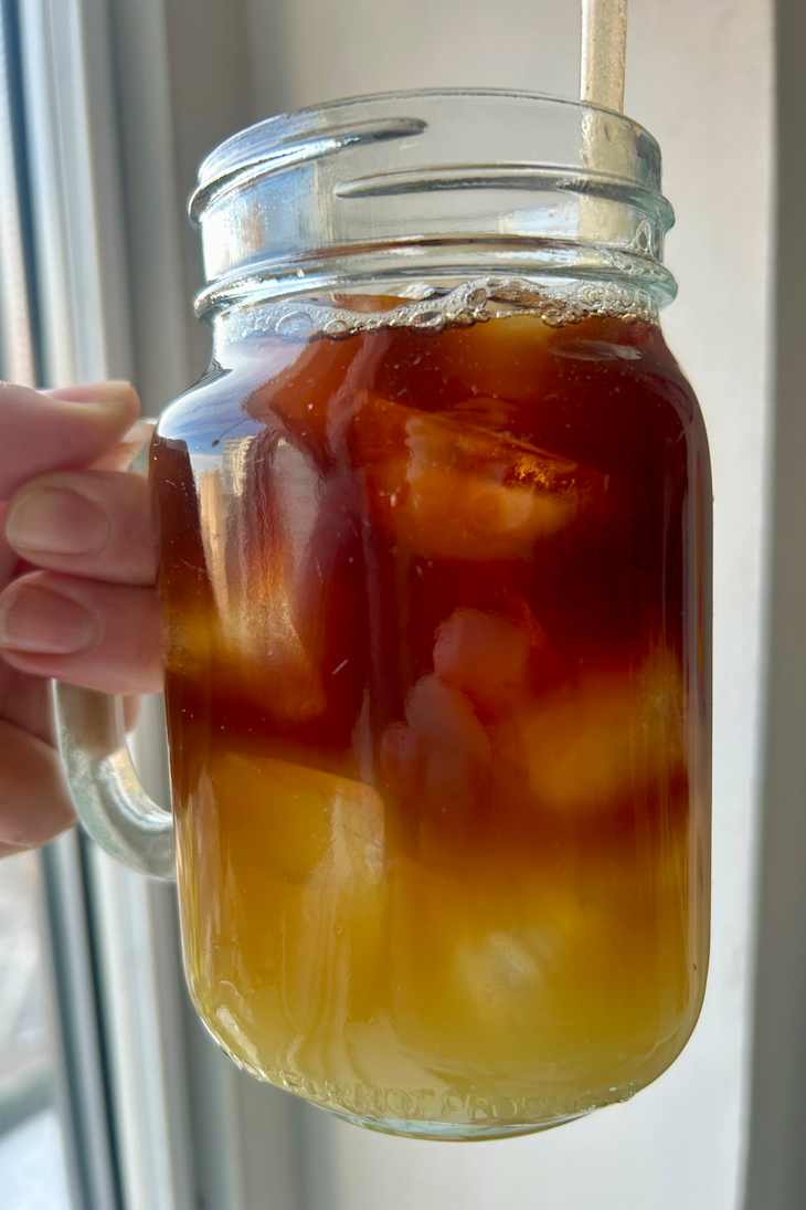 To make the Trader Joe’s pineapple cold brew, prepare the ground coffee in your preferred coffee-making method — I use my cold brew maker. You can also use a French press and pour the hot coffee directly over ice (but if you have the time, place the brewed coffee in the refrigerator to chill). Once the coffee is prepared add 4 ounces of pineapple juice to a cup filled with ice, and top with 4 ounces of the brewed coffee and stir to combine. That’s it!