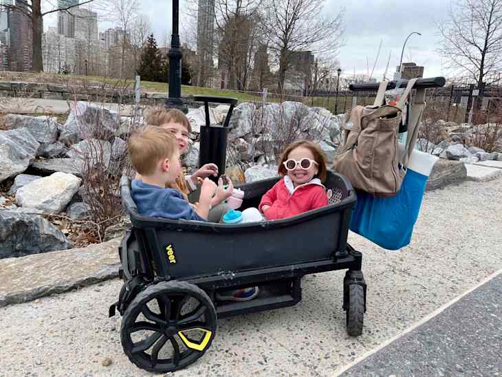 My kids get really giddy and playful when they’re in the Veer wagon together, like they’re in their own little world. The only fighting is over who gets to sit where, and it gets resolved, for the most part, by taking turns. The first time we used the rain cover, it was laughter all the way home.