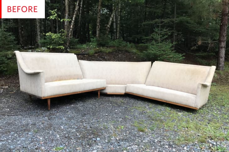 The day before I moved 1,000 miles to my current home, I spotted a mid-century sectional sofa at an estate sale and bought it for my new place. It was NOT easy cramming it into the U-Haul but it was such a score. It was SO comfy—especially for a vintage sofa. It had a deep seat, with a high back, and was the kind of sofa you could really lounge in. Sadly, the upholstery was threadbare, the foam was disintegrating, the wood was in rough shape, and it came with a gift with purchase (hello little mouse).