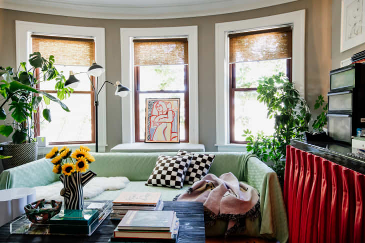 Michelle Trinh, who’s an advisor and consultant for MK. T Consulting (a company she founded in 2022), renovated her NYC apartment, and her basement-level bedroom features a soft curtain feature wall. “While, for some, a basement bedroom is a deal-breaker, it was a bonus for me! I love it to be pitch black when I sleep, and I usually don’t hang out in my bedroom.” As you can see in her tour, the curtains, along with making the room dark, create a soft, unified look that hides two unsightly and small windows.