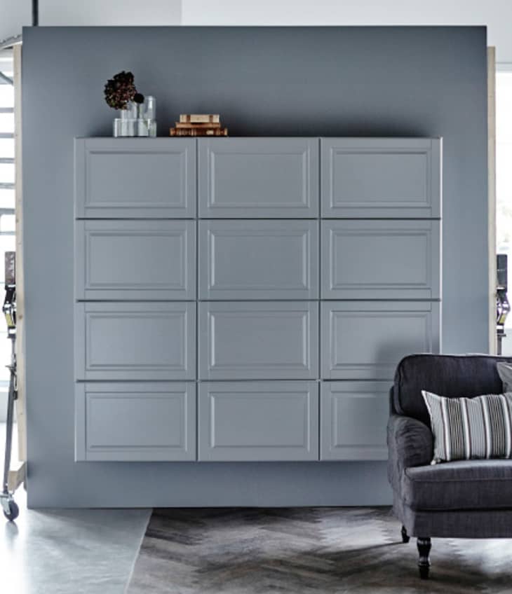 From IKEA comes this monochromatic storage wall using METOD cabinets. Even though the cabinets are the same color as the painted wall, the little amount of texture on the doors adds nice detail and interest. Plus, think of ALL THAT CLOSED STORAGE.