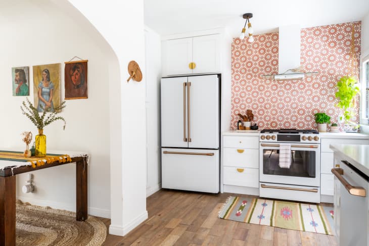 I started searching for a piece of furniture that would match the kitchen’s colorful vibe and keep things in order. We landed on a freestanding kitchen pantry from Wayfair, which helped us save space and score more storage for dry goods, extra condiments, and jarred sauces.