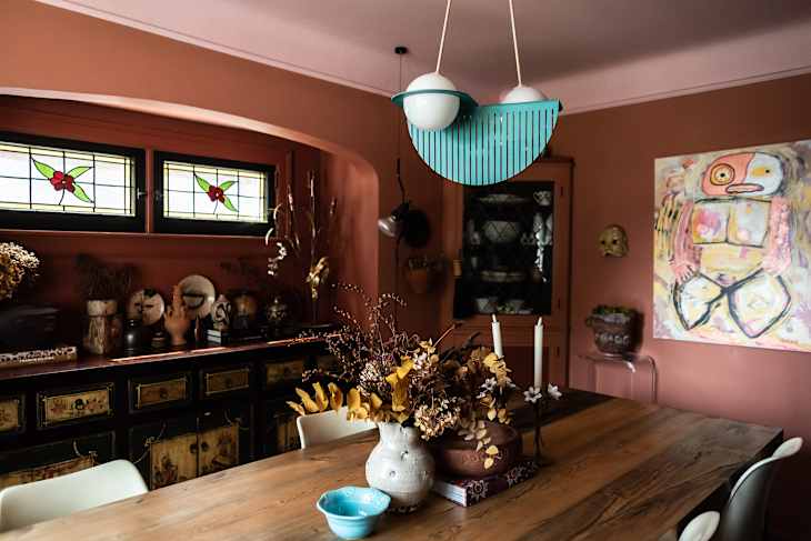 Color blocking, on the other hand, is all about contrast and boldness, which you can see at work in this dining room-meets-staircase area. It pairs distinct, often opposing colors to create graphic chunks of color with highly discernible borders across walls or between walls and ceilings (think: deep navy meeting crisp white, or blush pink capped with forest green). The goal is energy and impact — not continuity.