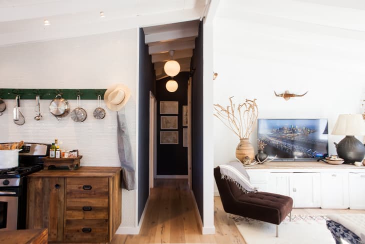The organizer behind Graceful Space, Mark Nedleman, says that when you live in a smaller dwelling, it’s helpful to use vertical space to make a space feel un-cluttered. One way he does that? He skips table lamps, and opts for “two-fer” lamps instead. Multiple lamp heads cover both overall room lighting and more specific task lighting in one. Another space-saving, clutter-cutting option: install swing-arm sconces where you’d usually have table lamps.