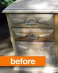 From the moment she saw it, Melanie loved the quirky lines of this solid wood desk. The piece had obviously been left outside to endure the seasons; the top had essentially been stripped of any protective finish. What many would see as a fault Melanie considered a benefit — less work to strip the piece down to ready for a makeover!Melanie wanted a masculine finish for her college student son, and even considered painting the entire desk black.